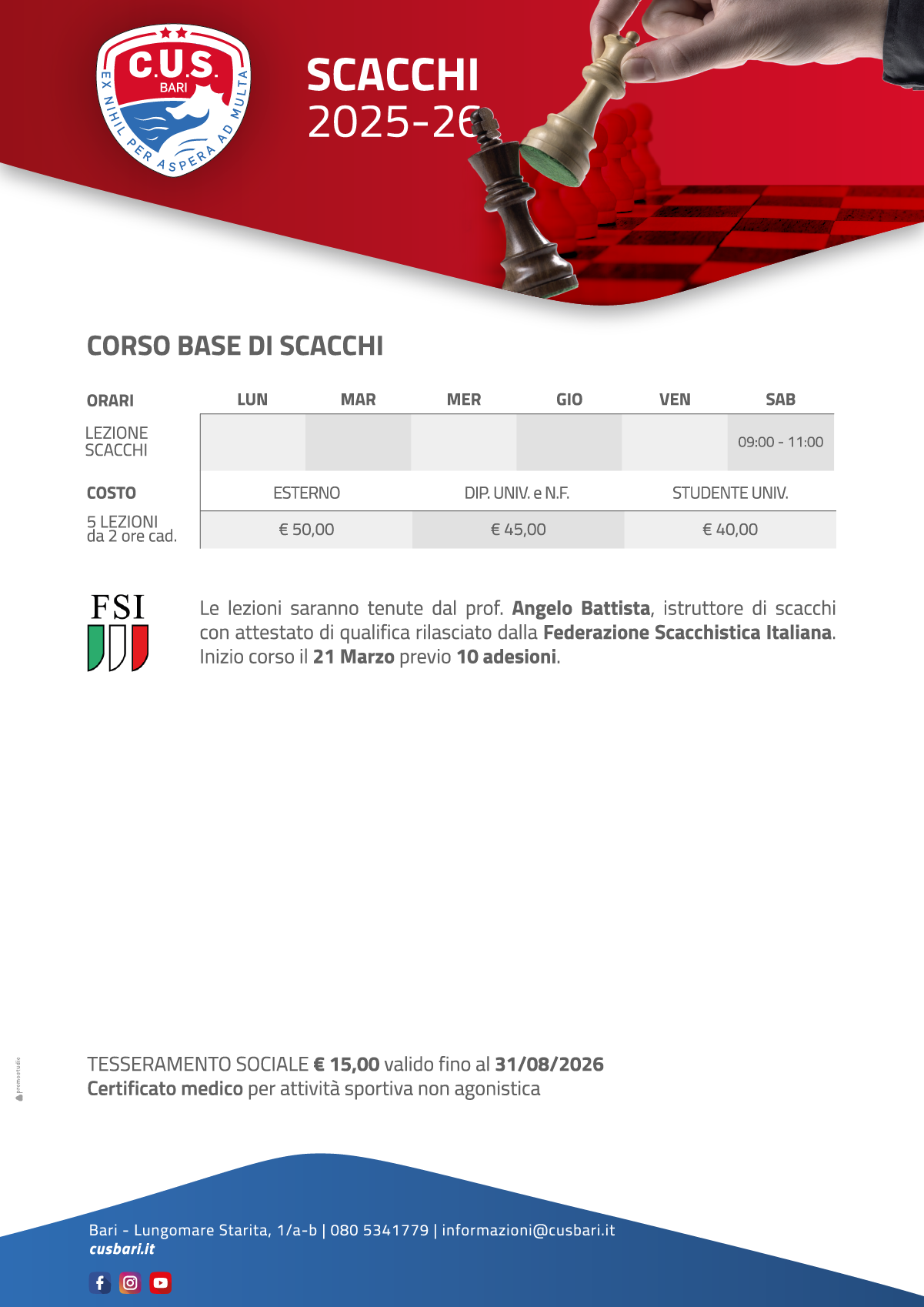 Il corso è rivolto agli studenti universitari e ai clienti del C.U.S. di ogni fascia di età, e non prevede né specifiche competenze pregresse, né particolari conoscenze e requisiti; se non il desiderio e la motivazione individuale di imparare quello che, da sempre, viene definito “il re dei giochi e il gioco dei Re”.